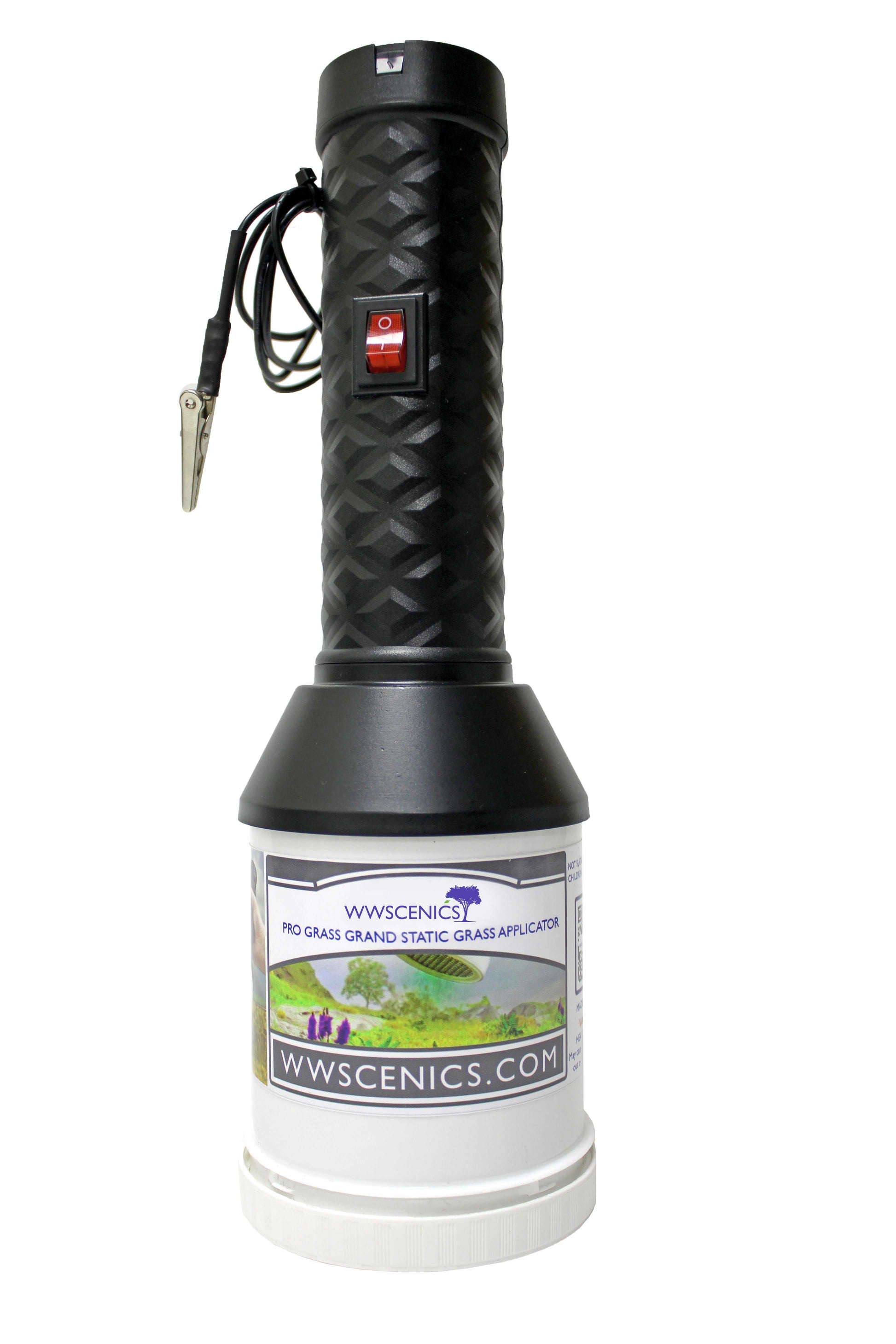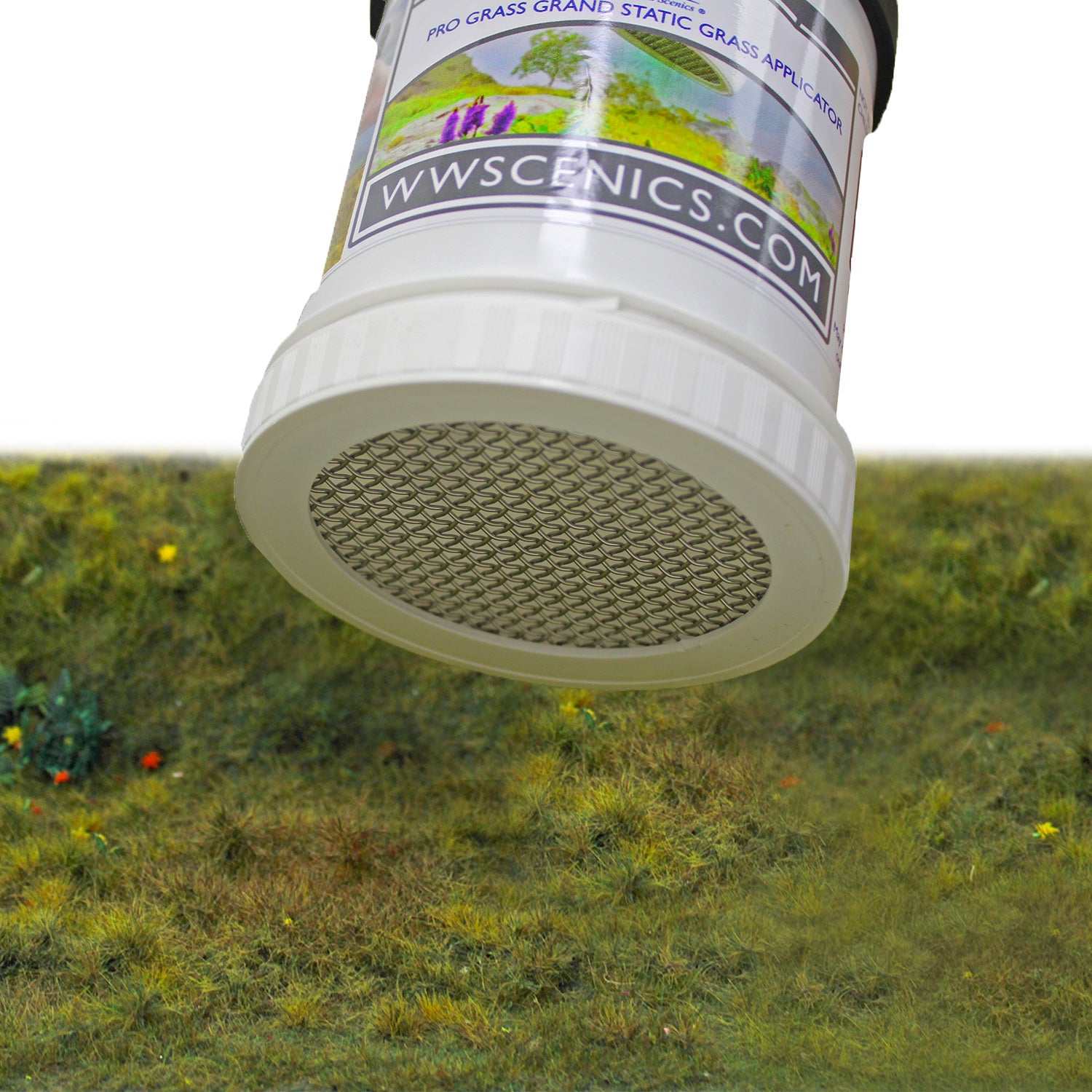 The Pro Grass Static Applicator uses a static electrical current to charge the static grass fibres, causing them to arrange in a vertical position on your selected surface, giving a realistic 3D effect. The Applicator is efficient with superb results (see images), wireless and only requires a 9v battery (so no unnecessary cables). With a lightweight design, yet robust and versatile. It is time-saving (quicker than manually applying static grass – with better results) and has an illuminating on/off switch so you know when in use. The Pro Grass Applicator can be used for: Quickly flocking small and vast areas Making grass tufts Adding detail to larger miniature model bases With the addition of our 3 applicator hopper heads in sizes small, medium and large, the applicator can be used with static grass fibres from 1mm to 12mm in length, enabling the user to achieve a realistic layered grass effect on any model railway layout, wargaming battleboard, model base or diorama.