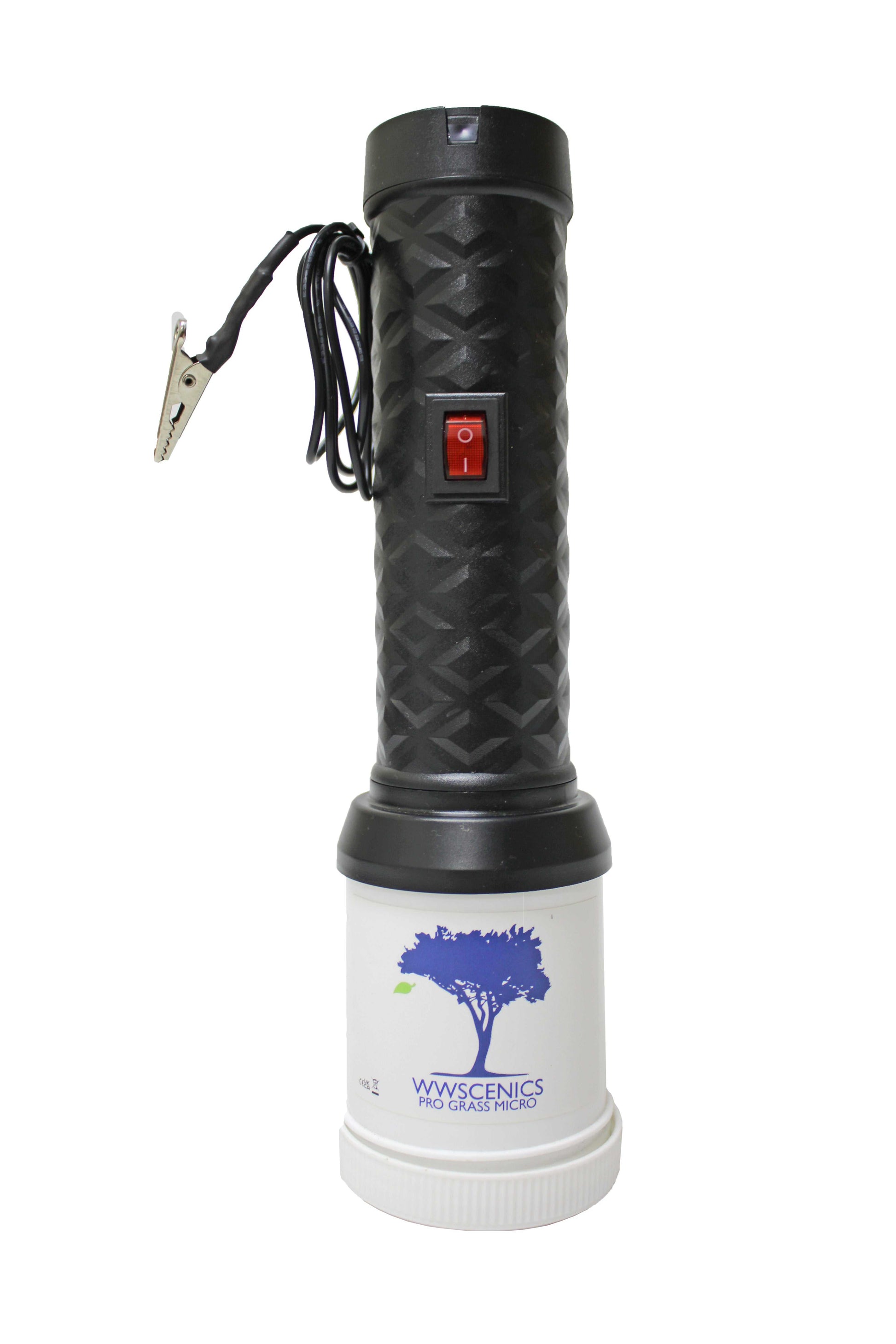 The Pro Grass Micro Applicator by WWScenics is a more compact, less powerful applicator ideal for smaller landscapes and areas. It comes with a medium sieve head suitable for 1mm, 2mm, 4mm and 6mm static grass and requires a PP3 9V battery (not supplied) to provide a static electrical current to charge the static grass fibres, causing them to arrange in a vertical position on your selected surface, giving a realistic 3D effect. The Micro Applicator is efficient with superb results (see images), wireless and only requires a 9v battery (so no unnecessary cables). It has a lightweight design yet is robust, versatile and time-saving (quicker than manually applying static grass – with better results). The Pro Grass Micro Applicator can be used for: Quickly flocking smaller areas Making grass tufts Adding detail to miniature model bases For larger landscapes, the Pro Grass Applicator is recommended.